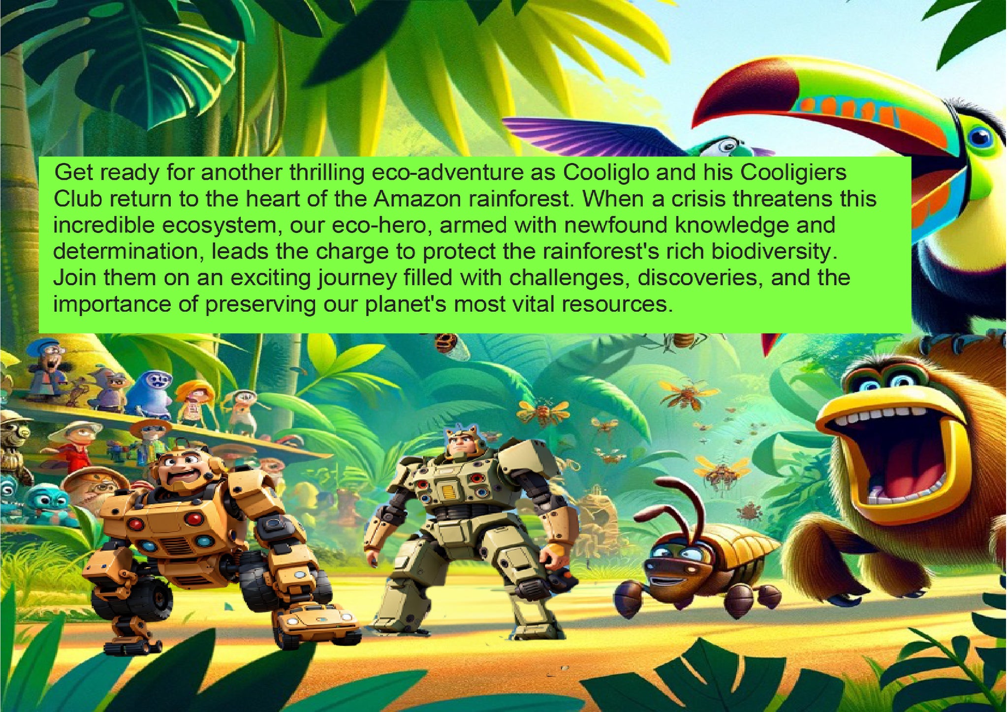 Get ready for another thrilling eco-adventure as Cooliglo and his Cooligiers Club return to the heart of the Amazon rainforest. When a crisis threatens this incredible ecosystem, our eco-hero, armed with newfound knowledge and determination, leads the charge to protect the rainforest's rich biodiversity.